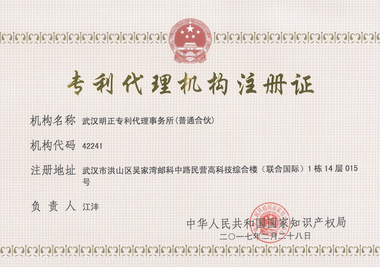 明上知識產(chǎn)權配合國家專利局的工作,于2017年2月28日,正式成立明正專利代理事務所,并且已在國家專利局備案,取得專利代理機構注冊證。旨在培育一批專業(yè)化、國際化的知識產(chǎn)權服務者,為市場主體和創(chuàng)新主體的知識產(chǎn)權發(fā)展提供有效支撐和保障,也為明上的新老客戶提供更專業(yè)更優(yōu)質的專利代理服務!