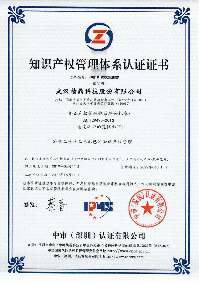 熱烈祝賀武漢精鼎科技股份有限公司于2019年9月獲得知識產(chǎn)權貫標認證證書,這意味著精鼎科技在知識產(chǎn)權領域獲得到重要認可,在知識產(chǎn)權方面得到進一步規(guī)范和在綜合競爭力得到進一步提升。