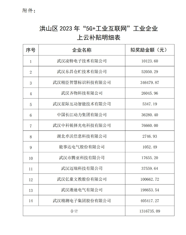 附件:洪山區(qū)2023年“5G+工業(yè)互聯(lián)網(wǎng)”工業(yè)企業(yè)上云補(bǔ)貼明細(xì)表